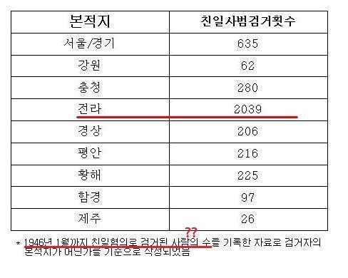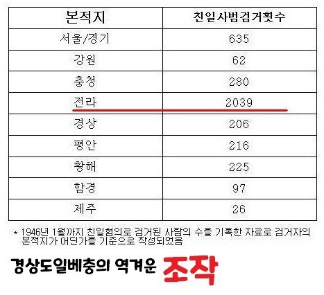 아래는 인터넷에 떠도는 전라도 친일사범 조작표를 보고